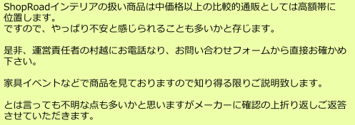 | 私たちは、「ネット通販を通して、いいもの を全国へ!」の理念を全うするために結集し会社を運営しています。 不動産業を営む代表取締役の幅広い人脈、接客営業に長けた運営統括責任者、YouTubeから盾を授かりYouTuberとして活躍する制作担当取締役、それをバックアップするドローンの達人兼監査役。そして紅一点の財務兼顧客担当取締役。 そして、どんなに良い商品でも、手に取って見ることのできないネット上の商品を画像や映像を通してよりリアルに、文字を通してより詳しく丁寧にご説明し、ご納得された上でお求めいただきたい。そんな想いを共有しています。 運営責任者の村越は家具イベントでWeDOStyleのブースで販売員として参加しております。 ![]() ここで得た知識やお勧めしたい商品を当ショップで全国の皆様にご紹介して参ります。 特定商取引法に基ずく表示 会社概要 |